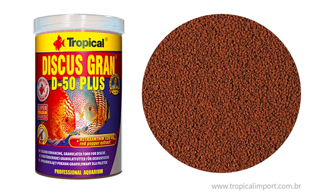 D-50 Plus é um alimento completo, com alto teor de proteínas, em forma de flocos, para Acará-disco e outras espécies de peixes ornamentais, com altas exigências nutritivas. Devido o alto teor de proteína (50%), essa é uma ração ideal para os peixes reprodutores e juvenis. O seu valor nutritivo extremamente alto, combinado com um conjunto de vitaminas e micronutrientes, fazem com que os peixes estejam sempre saudáveis e desovem voluntariamente.
