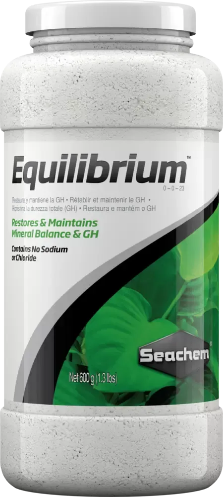 Equilibrium é especificamente pensado para estabelecer o conteúdo mineral ideal para aquários com plantas. Não contém sódio ou cloreto (o que pode ser prejudicial, em altos níveis para aquários com plantas). É ideal para uso em água com osmose reversa (RO) ou deionizada (DI), assim como para qualquer água deficiente em minerais. Aumenta o conteúdo de minerais essenciais/eletrólitos (GH) da água para equilibrar e promover a estabilidade da dureza de carbonatos.