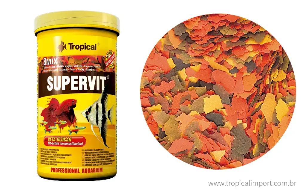 Supervit é uma ração com múltiplos ingredientes, em flocos com beta-glucano, astaxantina, algas kelp, spirulina, crustáceos, entre eles o saboroso krill. Supervit é um alimento com oito diferentes tipos de flocos, cujos ingredientes são: o natural estimulante imunológico beta-glucano, astaxantina, algas kelp, spirulina, crustáceos, entre eles o saboroso krill. Uma seleção cuidadosa de dezenas de ingredientes de alta qualidade, enriquecido com um conjunto de vitaminas e microelementos especialmente selecionados assegurando as necessidades nutritivas e energéticas das mais exigentes espécies de peixes. A rica fórmula do Supervit faz com que seja usado em aquários comunitários com várias espécies, onde constitui uma base da dieta complementar das necessidades em alimentos vegetais e de alto teor em proteínas.