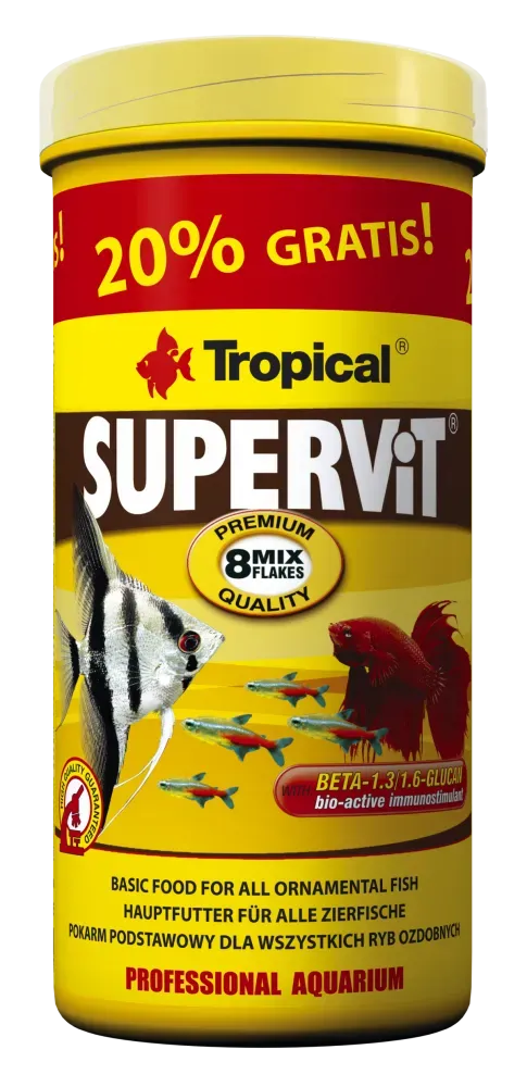 Supervit é uma ração com múltiplos ingredientes, em flocos com beta-glucano, astaxantina, algas kelp, spirulina, crustáceos, entre eles o saboroso krill. Supervit é um alimento com oito diferentes tipos de flocos, cujos ingredientes são: o natural estimulante imunológico beta-glucano, astaxantina, algas kelp, spirulina, crustáceos, entre eles o saboroso krill. Uma seleção cuidadosa de dezenas de ingredientes de alta qualidade, enriquecido com um conjunto de vitaminas e microelementos especialmente selecionados assegurando as necessidades nutritivas e energéticas das mais exigentes espécies de peixes. A rica fórmula do Supervit faz com que seja usado em aquários comunitários com várias espécies, onde constitui uma base da dieta complementar das necessidades em alimentos vegetais e de alto teor em proteínas.